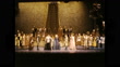 Actors dressed in medieval clothing performing "Camelot" on Broadway stage; knights on tall prop horses; people dancing around in court and performing acrobatics; one of the performers is Julie Andrews; along starring in the show is Richard Burton and Robert Goulet; performers standing in a row on stage and woman in the middle bowing to the audience