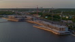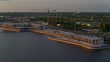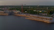 Vista aérea de vários guindastes de torre no pátio do edifício em uma orla em Charlotte Harbor, Flórida, no crepúsculo da noite. Imagens feitas por drones com movimento de câmera panorâmula. - Vídeo de acervo 4K