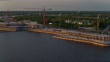 Aerial view of new construction on a waterfront in Charlotte Harbor, Florida, USA, with multiple tower cranes at the building yard. Drone-made 4K UHD B-ROLL footage.
