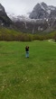 Vista aérea de mulher em Prokletije enquanto drone voa de volta. Vídeo vertical - Vídeo de acervo 4K