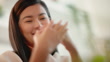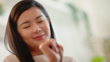 Mulher asiática usando creme hidratante para as mãos em sua vida diária na sala de estar em casa - Vídeo de acervo 4K