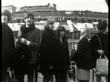 Beatles fans screaming and waving from airport as they leave for Austria / Beatles lined up: George Harrison, Paul McCartney, John Lennon accompanied by his wife Cynthia Lennon and Ringo Starr and his wife, Maureen Starkey / Beatles board plane, followed up steps by actor Victor Spinetti (co-star in film 'Help'). The Beatles leaving for Austria on March 13, 1965 in London (Footage by Getty Images)