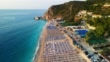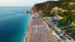 Amazing coast with beautiful beach with parasols in a row and small village around on Ionian sea. Kathisma beach, Lefkada island, Greece