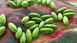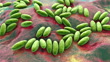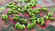 Animation of several Brucella bacteria on a surface. This is the cause of the disease brucellosis, a zoonosis typically caught from infected livestock. It causes a recurring fever, joint pain, fatigue and foul-smelling sweat. It can be fatal if left untreated. Brucella is a small Gram-negative bacterium that lives inside cells in its host