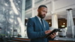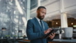 Businessman working on a digital tablet while walking in a corporate office. Marketing professional and black man doing research on the internet or a website with a mobile device for startup project