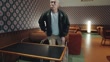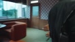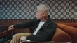Asian mature man walks into a retro lounge with patterned walls and warm-toned furniture, sits down on a couch, and looks around as the camera circles him, conveying confidence and vintage cinematic style.