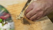 Close-up of man using kitchen knife to prepare garlic, then adding it to white onion, plum tomatoes, and green bell peppers in stainless steel bowl.