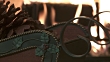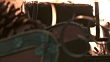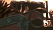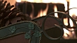 Closeup of a decorative holiday sleigh containing pine cones sits in front of a fire place. Rack focus from the fire to the sleigh.