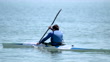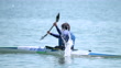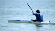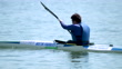 Close-up shot of a paraplegic athlete racing his kayak during a paracanoe competition on a river in Japan
