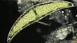 Closterium desmid. Light microscopy of a Closterium sp. desmid green alga. Desmids are a common group of freshwater single-celled algae that have intricate cell walls. Darkfield illumination.