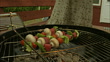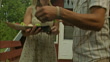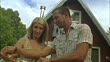 CU, TU, TD, Couple barbequing shish kabobs outside holiday cabin, Fish Creek, Wisconsin, USA - Vídeo de acervo HD