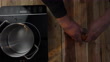 Poached egg preparation step. Cracking egg into ramekin makes it easier to slide into pan. Cooking pan filled with water on induction burner.