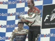 STAVELOT, BELGIUM - JULY 2: (AUDIO OMITTED) A delighted Jacques Cornu sprays champagne on the podium after winning the 250cc race, flanked by second placed Sito Pons (L) and third placed Carlos Cardús (R) at the Belgian Motorcycle Grand Prix at Circuit de Spa-Francorchamps on July 2, 1989 in Stavelot, Belgium. (Footage by Duke Video/Getty Images)