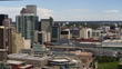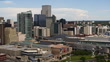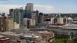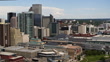 Aerial view of Denver skyline showcasing the Colorado Convention Center in foreground with its distinctive glass roof and the Denver Performing Arts Complex. Downtown skyscrapers dominate the center with prominent glass high-rises and office buildings. In the background, the gold dome of the Colorado State Capitol is visible among residential neighborhoods. The foreground includes a public sculpture and landscaped green space. Video features smooth panning motion that sweeps across the urban landscape, highlighting the contrast between dense downtown development and surrounding residential areas.