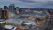Aerial establishing shot of the downtown district of Denver, Colorado on a cold evening in early Spring.