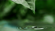 Extreme close up super slow motion droplet falling from green leaf,rippling water surface