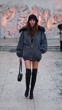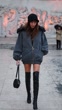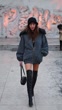 PARIS, FRANCE - JANUARY 25: (SLOW-MO) Estelle Chemouny wears a grey zipper jacket, over knees bot, black bag, hat outside Patou during the Haute Couture Spring/Summer 2024 as part of Paris Fashion Week on January 25, 2024 in Paris, France. (Footage by Christian Vierig/Getty Images)