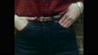 Sequence of fashion models wearing jeans, posing in various locations outside. Includes a close up on the waistline of one model, wearing a tartan shirt and belt, with blue jeans and pink nail polish, her hands in her pockets, and another model standing on a boat posing as though she is steering the ship's wheel; 1981 (LSFE055A - AEVZ001J)