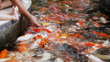Pai e filho compartilham serenidade à beira da lagoa, alimentando peixes koi vibrantes. - Vídeo de acervo 4K