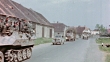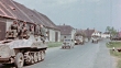 HA German Army soldiers in half-track armored personnel carrier driving down street, followed by staff car