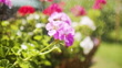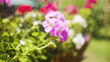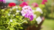 Watering beautiful flowers in garden with back light. Looks like rain. Slow motion