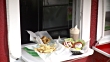 MS Girl (8-9) serving fast food with root beer float to customer at snack bar stand / Stowe, Vermont, USA - Vídeo de acervo HD