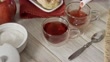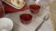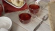 High angle close-up view of woman hands pouring a hibiscus hot tea in a cup on a white rustic table. Jamaica flower tea infusion.