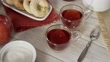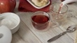 Visão de close-up de alto ângulo das mãos da mulher derramando um chá quente hibisco em uma xícara em uma mesa rústica branca - Vídeo de acervo 4K