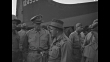 High angle view of men clustered around an airplane / Gen. Douglas McArthur steps from small door in the plane and stands with Australian Gen. Sir Thomas Blamey, who holds a cigarette / MacArthur with airplane behind / VS he climbs into a jeep carrying a cane and the vehicle drives along a dirt road in a jungle / vehicles drive across a corduroy bridge and come to a stop in camp / MacArthur and Blamey under a tarp / VS MacArthur sips from a cup, chats with troops, holds a cigar, leans on cane / MacArthur awards correspondent Vern Haughland a Silver Star for bravery / Note: exact day not known