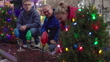 Static camera shot captures three individuals crouching near decorative garden bed installing large retro-style Christmas bulb decorations on stakes. Scene features blue, green, and red illuminated bulbs against mulch ground cover with decorated evergreen trees displaying multicolored string lights in background during evening hours, creating festive atmosphere.