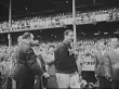 Joe DiMaggio exits dugout at Yankee Stadium wearing baseball jacket over his uniform as officials and crowd in stands applaud / crowd rises to its feet / WS ceremony honoring DiMaggio; automobile in center is a gift to him / DiMaggio waves next to car / rear WS DiMaggio's mother Rosalia waves from the front row of the stands as photographers approach her / DiMaggio's brother, Dom DiMaggio of the Boston Red Sox, runs past car to greet Joe / Dom and Joe shake hands as flashbulbs pop / from Greatest Headlines of the Century series