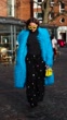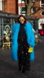 COPENHAGEN, DENMARK - FEBRUARY 1: (SLOW-MO) Karin Teigl wears yellow sunglasses, Hermes bag, blue faux fur coat, pants with Chanel logo print outside Lovechild 1979 during the Copenhagen Fashion Week Autumn/Winter 2023 on February 1, 2023 in Copenhagen, Denmark. (Footage by Christian Vierig/Getty Images)