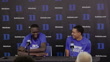 DURHAM, NORTH CAROLINA - SEPTEMBER 27: Khaman Maluach (L) of the Duke Blue Devils speaks to the media about team chefs, Sam and V, as director of player development Justin Robinson listens, during Duke Men's Basketball Media Day at Cameron Indoor Stadium on September 27, 2024 in Durham, North Carolina. (Footage by Lance King/Getty Images)