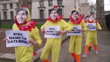 Labour Party campaigners, dressed as chickens and wearing PM Rish Sunak masks, hold name the date signs as they campaign for a General Election to be called (BBC News 1pm Bulletin - 15/03/2024 - AEXZ288W)