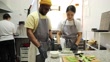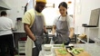 A female chef is teaching her colleague how to prepare sushi at the sushi bar kitchen.