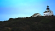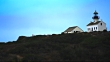 Lighthouse at point Loma, California on a cloudy day. Unrecognizable tourists walk in the distance.