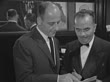 1952: SARDI'S RESTAURANT: MANHATTAN, NEW YORK: VS Male restaurant greeter greeting guests, people, in Sardi's Restaurant, caricature drawings hanging on wall BG, REPEATED TAKES. NYC, West 44th Street
