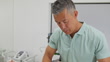 Medium shot of a mature Asian therapist gently assisting a senior Caucasian woman by examining her hip flexibility. The therapist carefully supports her leg, moving it through a range of motion to assess flexibility and comfort, while maintaining a focused and attentive demeanor.