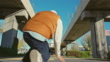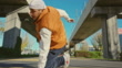 Low angle view of man in mid 20s wearing do rag, ski vest, and corduroy pants looking at camera and dancing in urban environment beneath elevated roadways.