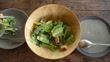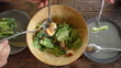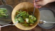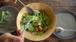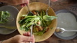 Pessoas comendo salada Caesar com garfo de tigela de madeira na mesa rústica, estilo de vida saudável e dieta de vegetais frescos - Vídeo de acervo 4K