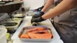 Side view close-up of an unrecognizable person rolling up and preparing sushi in the kitchen of a sushi bar.