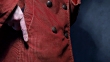 Human hand putting documents with leather cover in the pocket of rusty corduroy jacket