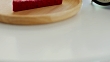 Red cake Strawberries cream cake on wooden dish on white table , dolly shot tilt up