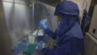 Scientist in protective gear working with coronavirus samples in Szentgothai Research Center