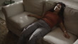 Slow motion of exhausted woman falling onto sofa and relaxing / Cedar Hills, Utah, United States - Vídeo de acervo 4K