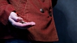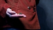 Small change in human hand holding it near the pocket of rusty corduroy jacket