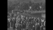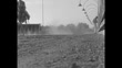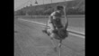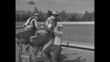 Title Card: "Tail Feathers Fly! Agua Caliente - Thousands flock to famous Mexican turf club to see ostriches run! Spills and laughs feature season's first race." / MS jockey mounts ostrich, with help / WS crowd watching, false start with jockey falling on track / WS actual start, follow three ostriches racing along track, one ostrich running along track / WS front view of three ostriches running; one ostrich runs to the edge and throws jockey over fence, two other ostriches run by in fg / CU ostrich running past / ostriches running, one falls / CU crowd watching / CU three ostriches running up, one runs against edge and falls / WS winning ostrich to the finish line, jockey falls off, ostrich runs away / VS winning ostrich swallows oranges / Note: exact month/day not known