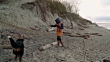 The attractive 50 years old mature woman with the Belgian mountain dog resting at the beach of the Baltic sea, Zelenogradsk, Kaliningrad region, Russia
