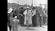 The facade of Del Mar racetrack as people approach it / view through trees of people on a walkway / two shots of Bing Crosby taking tickets at the gate (man in gaucho outfit at right) / crowded stands / Una Merkel looking over racing form / Pat O'Brien and wife Eloise / Bob Burns with wife Elizabeth looks through binoculars / Robert Taylor with Barbara Stanwyck / Lee Tracy at table eating and looking through binoculars
