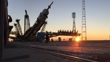 Tim Peake spends penultimate night on earth before heading to International Space Station; KAZAKHSTAN: Baikonur Cosmodrome: INT / NIGHT**BEWARE FLASH PHOTOGRAPHY**Various of Soyuz rocket on back of train as slowly coming out of hanger and past people (Rocket will carry Tim Peake (British Astronaut to International Space Station) DAWNTRACKING SHOT past horizontal rocket on trainLaunchpad One:SPEEDED UP TIMELAPSE Rocket being erected on launchpad at sunriseReporter to camera Russian Orthodox priests along near launch sitePeople along at launch siteAlexander Gerst (Astronaut) interview SOT